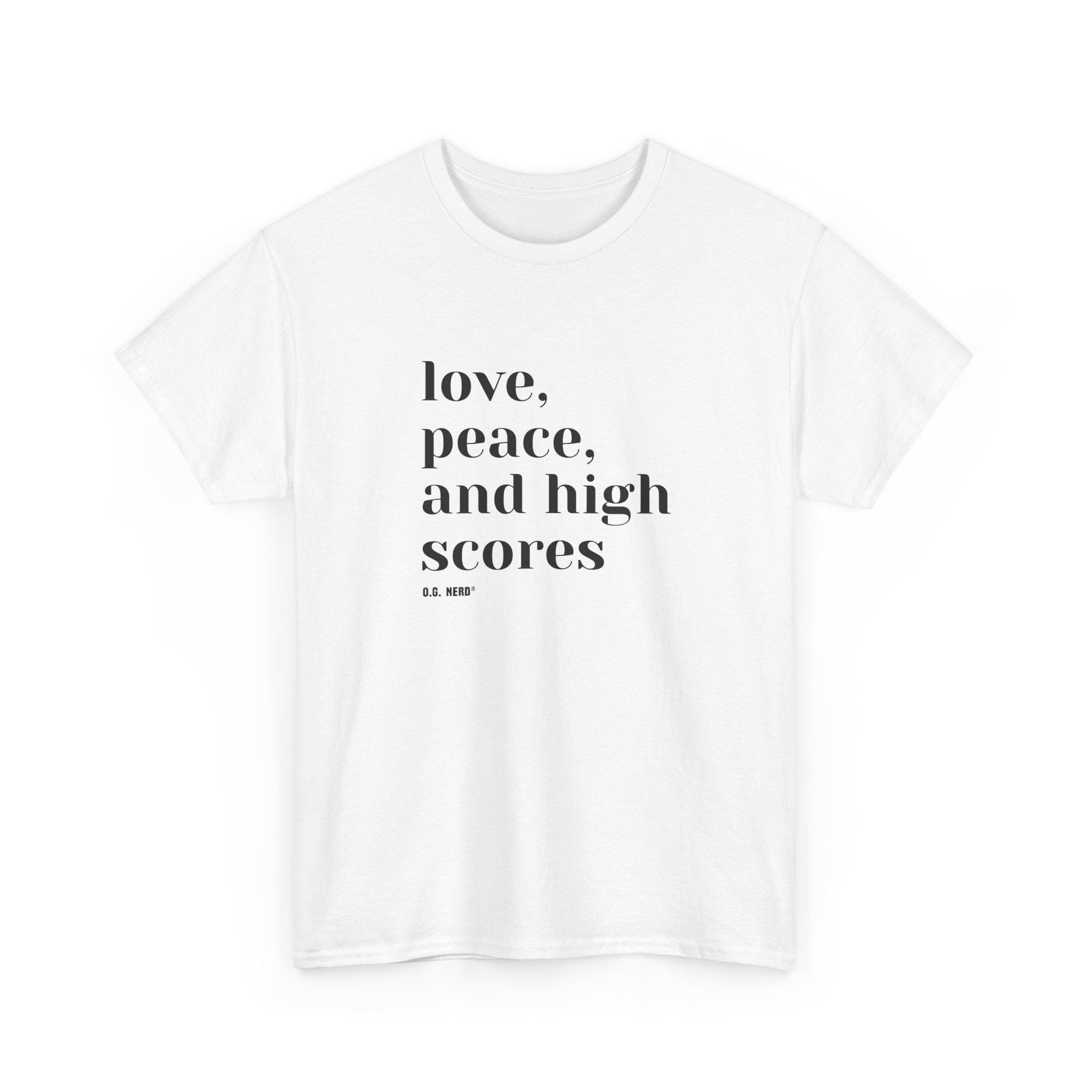 A clean, soft tee that speaks gamer-heart truth with quiet confidence. The crisp white shirt features bold, minimalist type: “love, peace, and high scores.” It sits light and relaxed on the shoulders, made from smooth, sturdy cotton that holds print detail and shape wash after wash. Wear it for long sessions, low-key hangouts, or when you want your vibe to say that kindness and competition can live in the same room. Subtle, modern, and honest — this tee layers easily under hoodies or stands alone with jeans and a worn-in controller in hand.